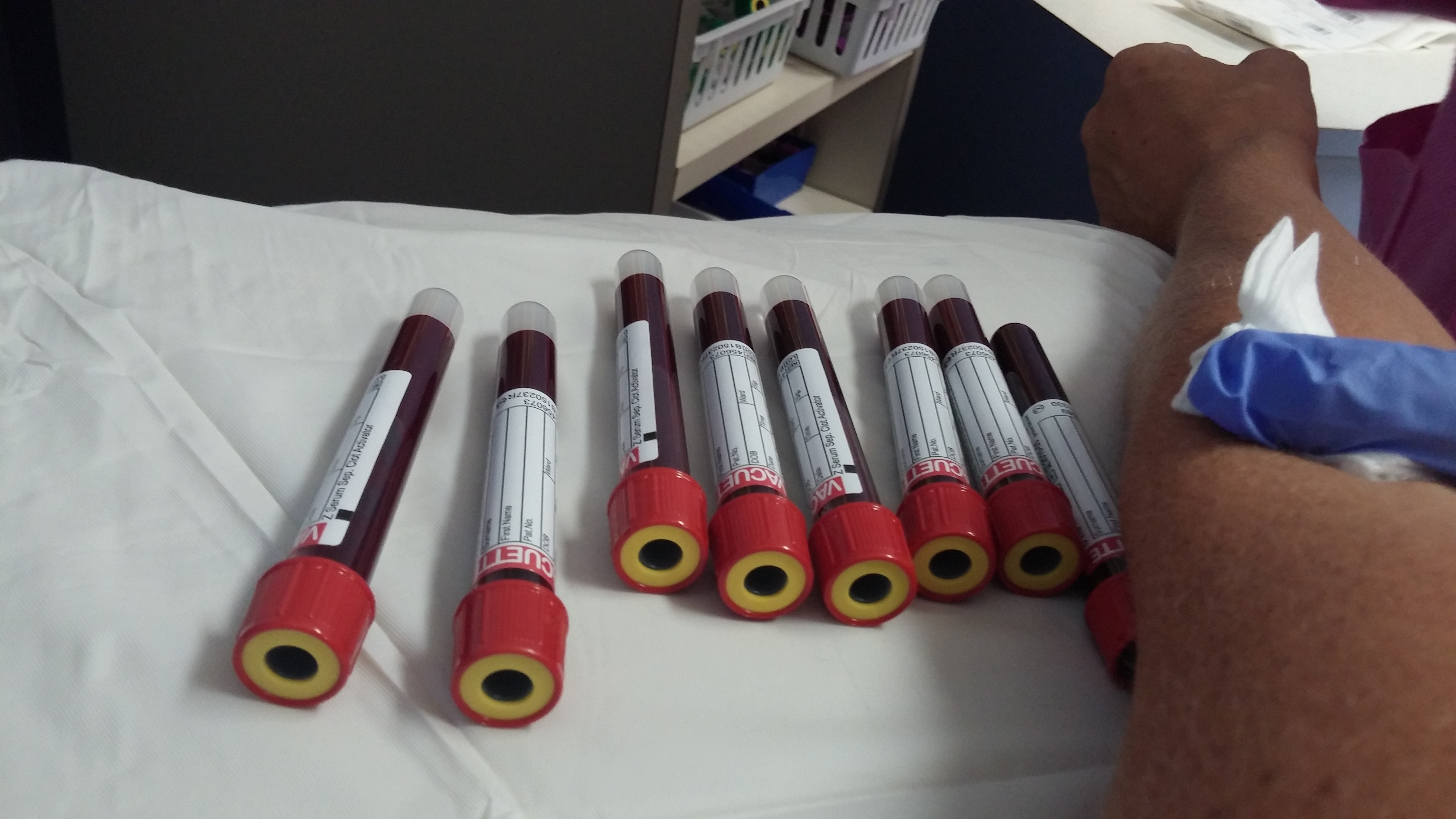 They wrote orders for lab work for an IgE RAST test which will test my blood for allergen reactions along with an anti-Pneumococcal antibody titre and a Tdap antibody titre. The titre tests are to check to see if I am deficient in the Pneumococcal, Tetanus-Diphtheria-Pertussis antibodies. Both of those have to do with the immune system and if I am deficient it would affect how my body fights infection. I went to the lab after my appointment and they drew 8 tubes of blood!!! (see picture below) Hopefully we will have answers after all of that. I’m not willing to accept that we don’t know what is causing the decline in my lung function, shortness of breath and increased asthma symptoms. If you are a CF happens reader then you know I saw the ENT doc last month and he said my sinuses were full of allergic inflammation. We are going to try a nose spray to help with that. The nose spray is Atrovent (Ipratropium bromide) which is actually part of the combo medicine, DuoNeb, I inhale. Interesting! She also gave me an inhaler called QVAR, which is basically the inhaled version of prednisone without the side effects. It hopefully will help with the tightness in my chest, wheezing and all the other asthma symptoms. If/when I see improvement I am to stop using it. It is for short term use only. Hopefully we will have answers this time. I see her again in 2 months.